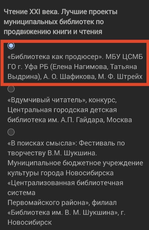 Проект «Библиотека как продюсер» - помощь активным читателям в продвижении их проектов (проработка, подготовка целевой аудитории, организационная и информационная поддержка и т. д.). В итоге лучшие проекты 2024 года были объединены в общую концепцию и программу поддержки читательских инициатив. Три масштабных проекта реализовались в течение года на площадках МБУ ЦСМБ ГО г. Уфа РБ. В результате читатели получили бонусы в виде приглашений в журналы и телепередачи, на них обратила внимание Администрация Демского района г. Уфы. Таким образом, библиотека впервые реализовала продюсерский потенциал учреждения культуры. Голосование за лучший проект проходит до 1 августа. Голосовать можно каждые 2 часа по ссылке www.bookind.ru/revizor/20....